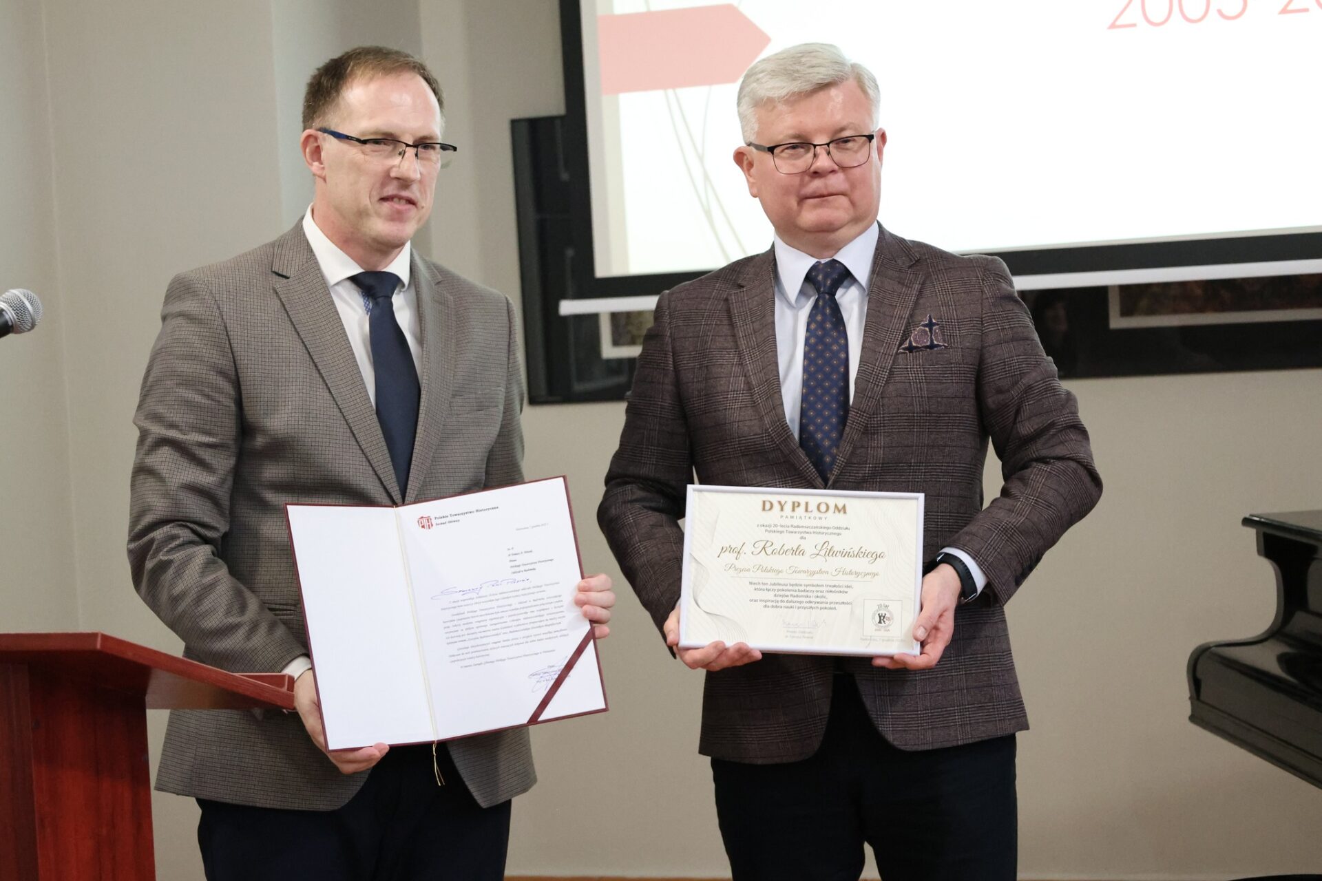 Prezes radomszczańskiego oddziału PTH, dr Tomasz Nowak, przypomniał najważniejsze momenty z 20-letniej działalności Towarzystwa. To były dwie dekady pełne konferencji, publikacji, badań, spotkań z mieszkańcami i inicjatyw, które ożywiały lokalną pamięć.