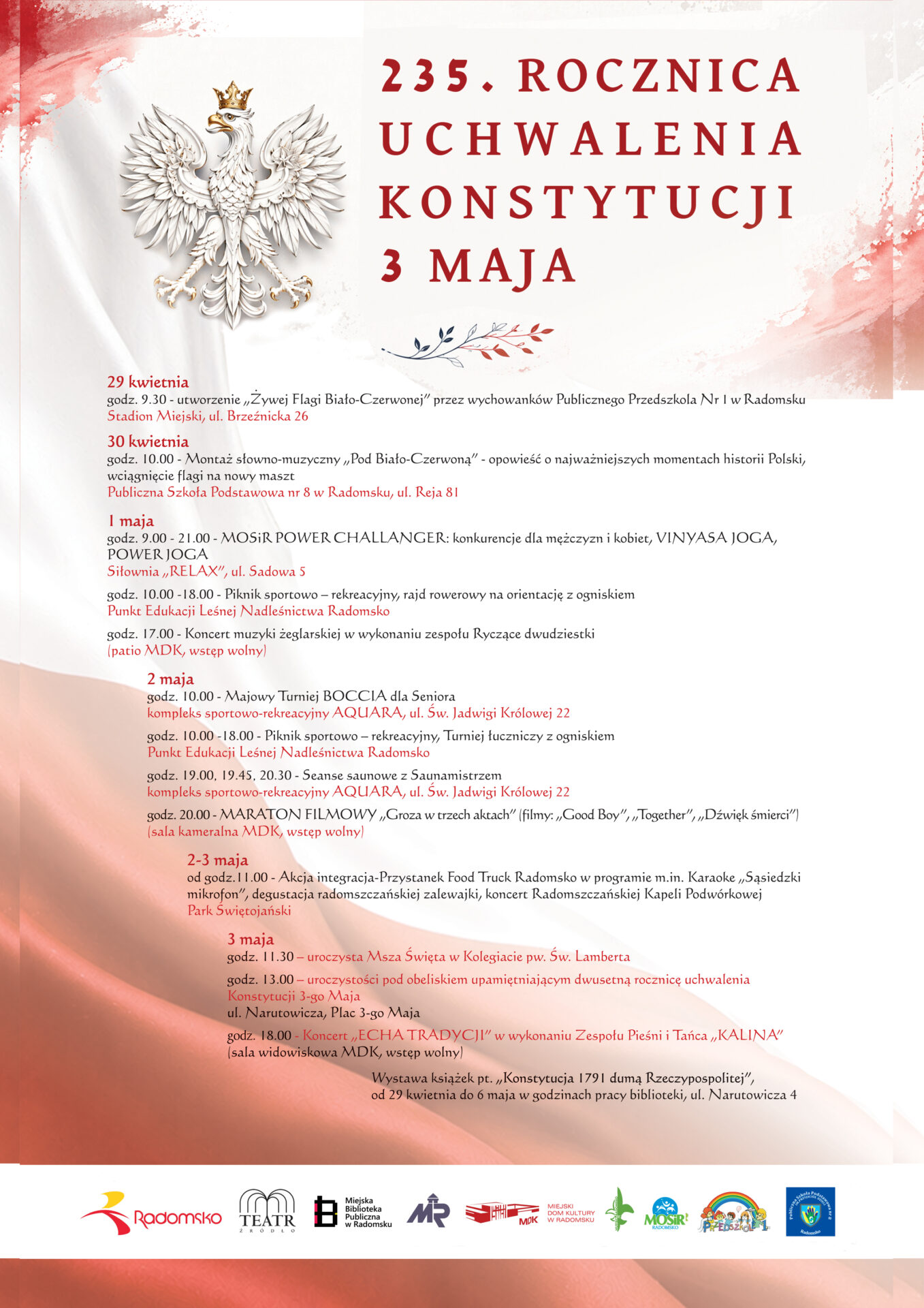 To będzie kilka dni pełnych emocji, wspólnego świętowania i biało-czerwonych akcentów. Urząd Miasta Radomska zaprasza mieszkańców do udziału w obchodach 235. rocznicy uchwalenia Konstytucja 3 Maja. W programie znalazły się zarówno uroczystości patriotyczne, jak i wydarzenia sportowe, kulturalne oraz rodzinne – każdy znajdzie coś dla siebie.