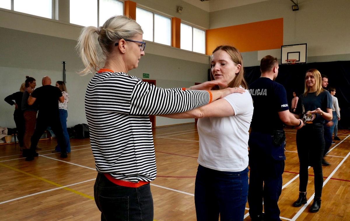 Następnie uczestnicy mieli możliwość przećwiczenia prostych, skutecznych i bezpiecznych technik samoobrony, które mogą pomóc w sytuacjach realnego zagrożenia. Policjanci pokazali, jak zachować spokój, kontrolę i właściwie reagować w przypadku agresji ze strony osób, z którymi pracownicy socjalni mają kontakt w swojej codziennej pracy.