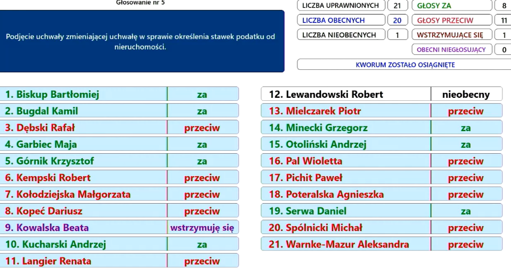 Po wielogodzinnej dyskusji radni przeszli do głosowania. Uchwała w sprawie podwyżki podatku od nieruchomości nie została przyjęta – 8 radnych było za, 11 przeciw, a 1 wstrzymał się od głosu. Stawki pozostają więc na niezmienionym poziomie.