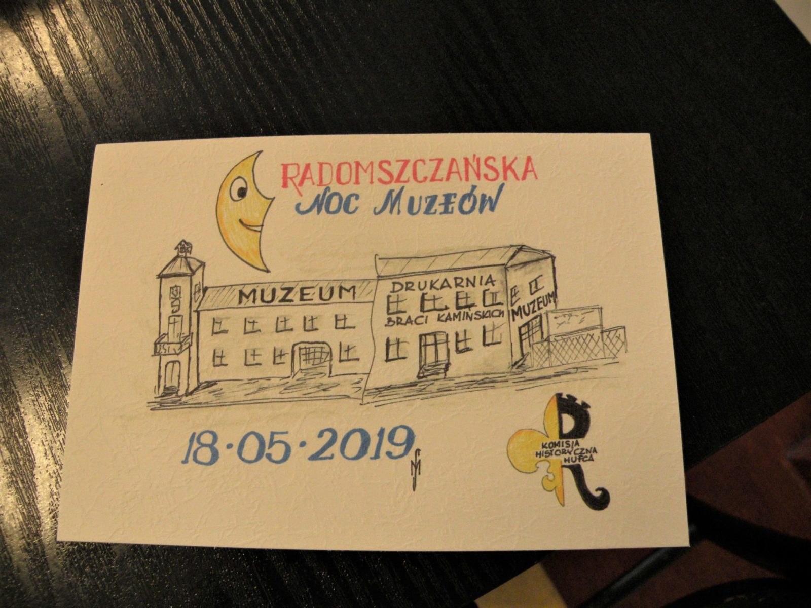 Radomszczańska Noc Muzeów rozpoczęła się w Muzeum Drukarstwa Rodziny Kamińskich (znajdującym się przy ul. Mickiewicza 5/7). Tam, oprócz uruchomienia zabytkowej maszyny otwarta został wystawa Poczty Harcerskiej, przygotowanej przez Annę Zatoń oraz Mariana Stalkę. Muzeum czynne będzie do godz. 24.00.