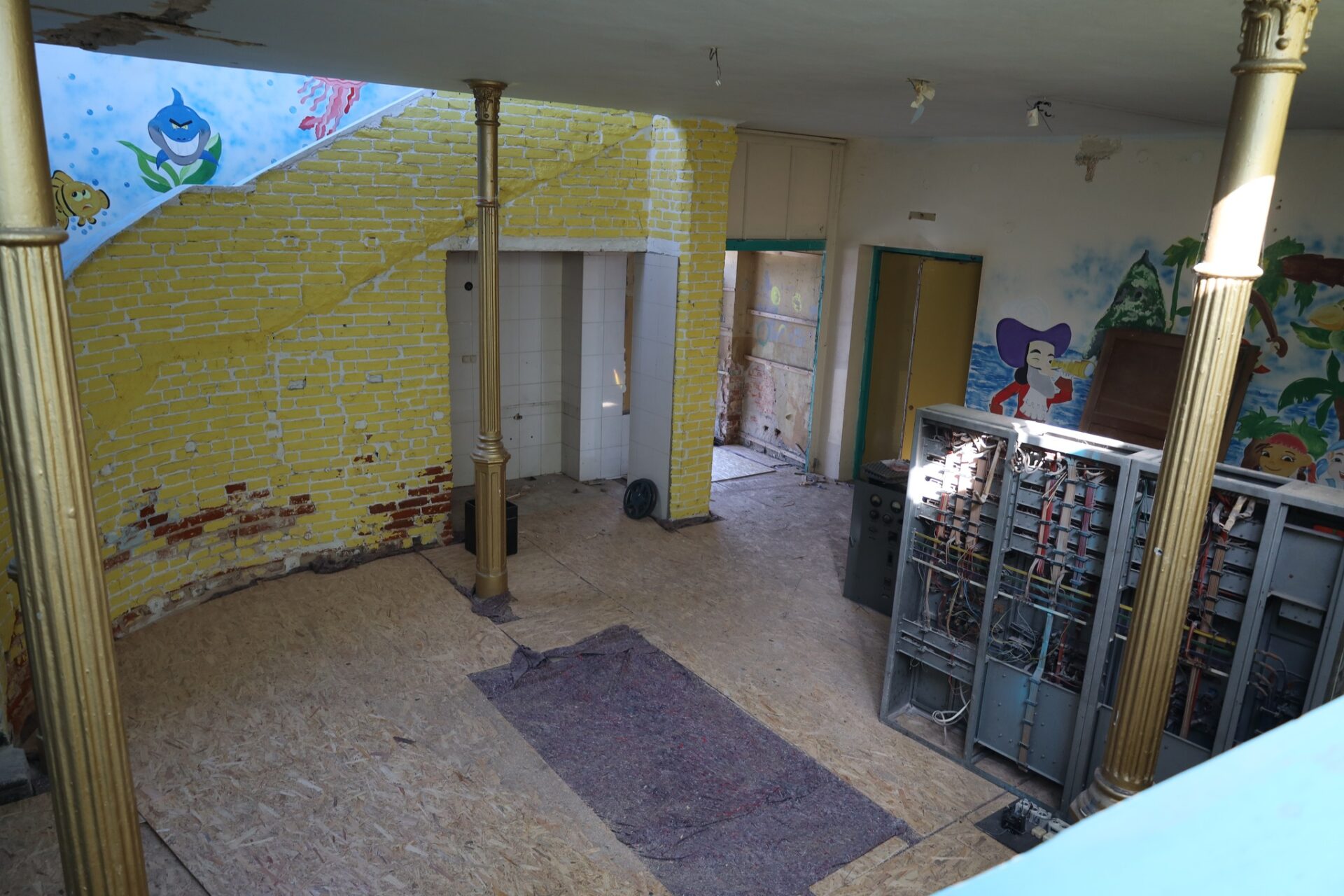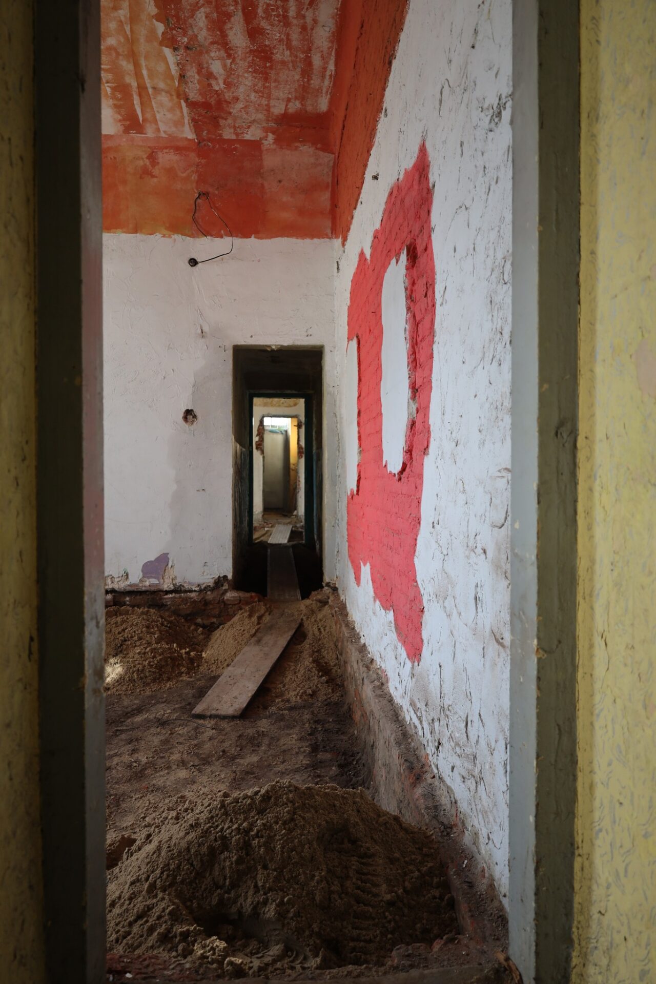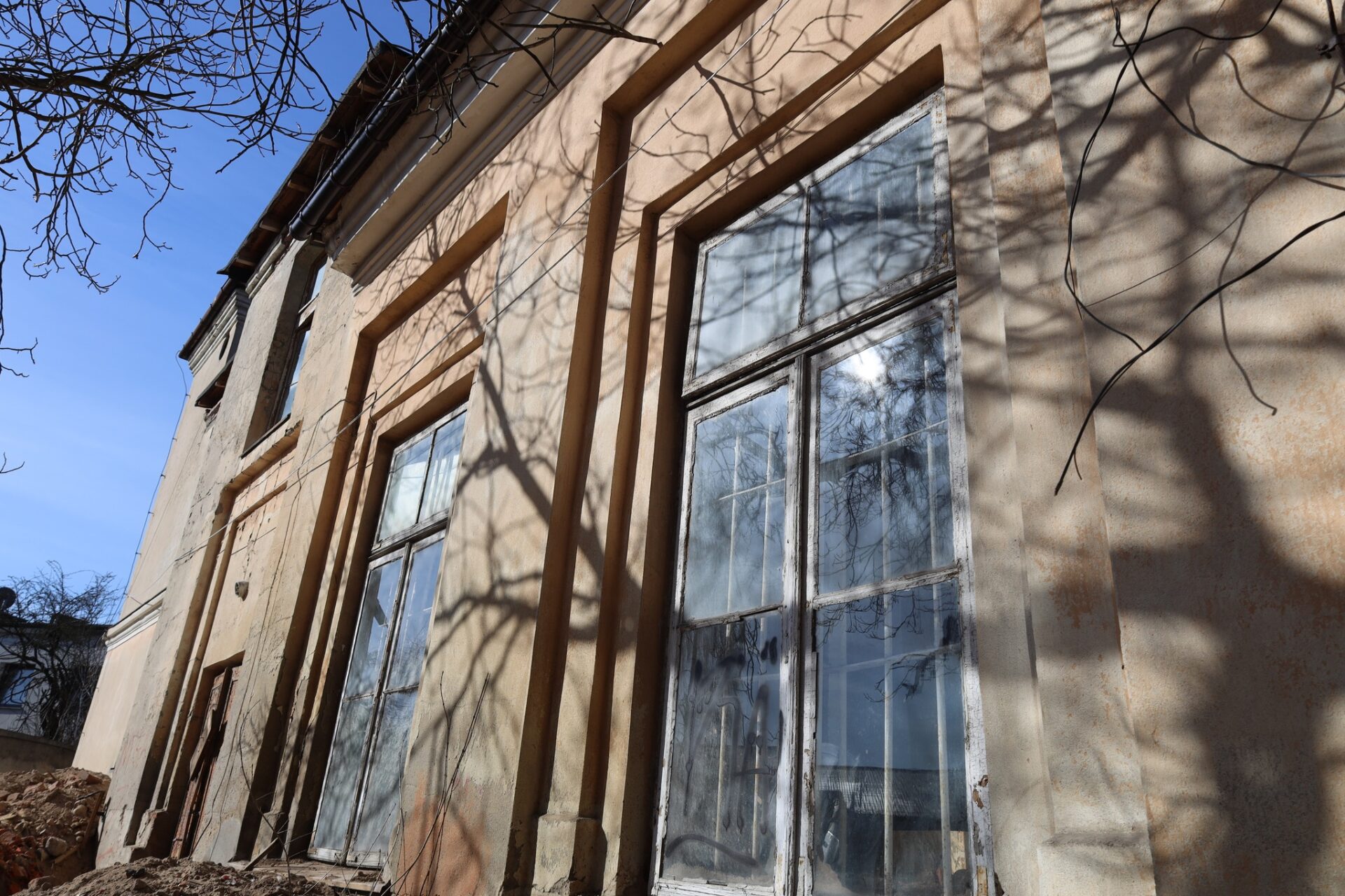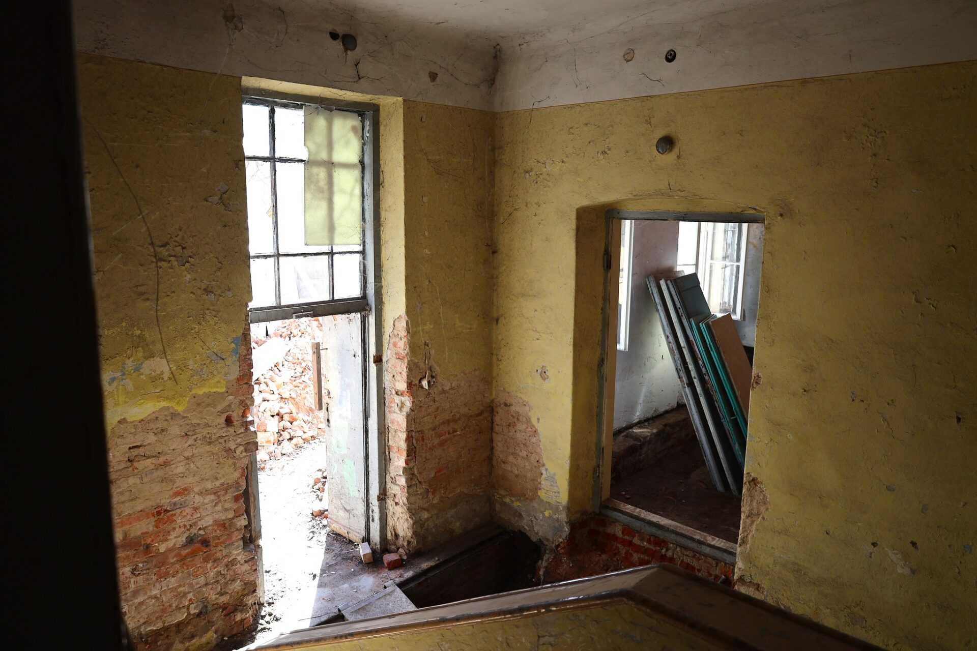 Obecnie w budynku prowadzone są prace rozbiórkowe, których głównym celem jest dotarcie do pierwotnej konstrukcji obiektu. Część ścian została już oczyszczona aż do cegły, a stare, zniszczone warstwy tynku zostały usunięte. Dzięki temu możliwe jest dokładne sprawdzenie kondycji murów oraz stropów, co pozwoli odpowiednio zaplanować dalsze działania remontowe.