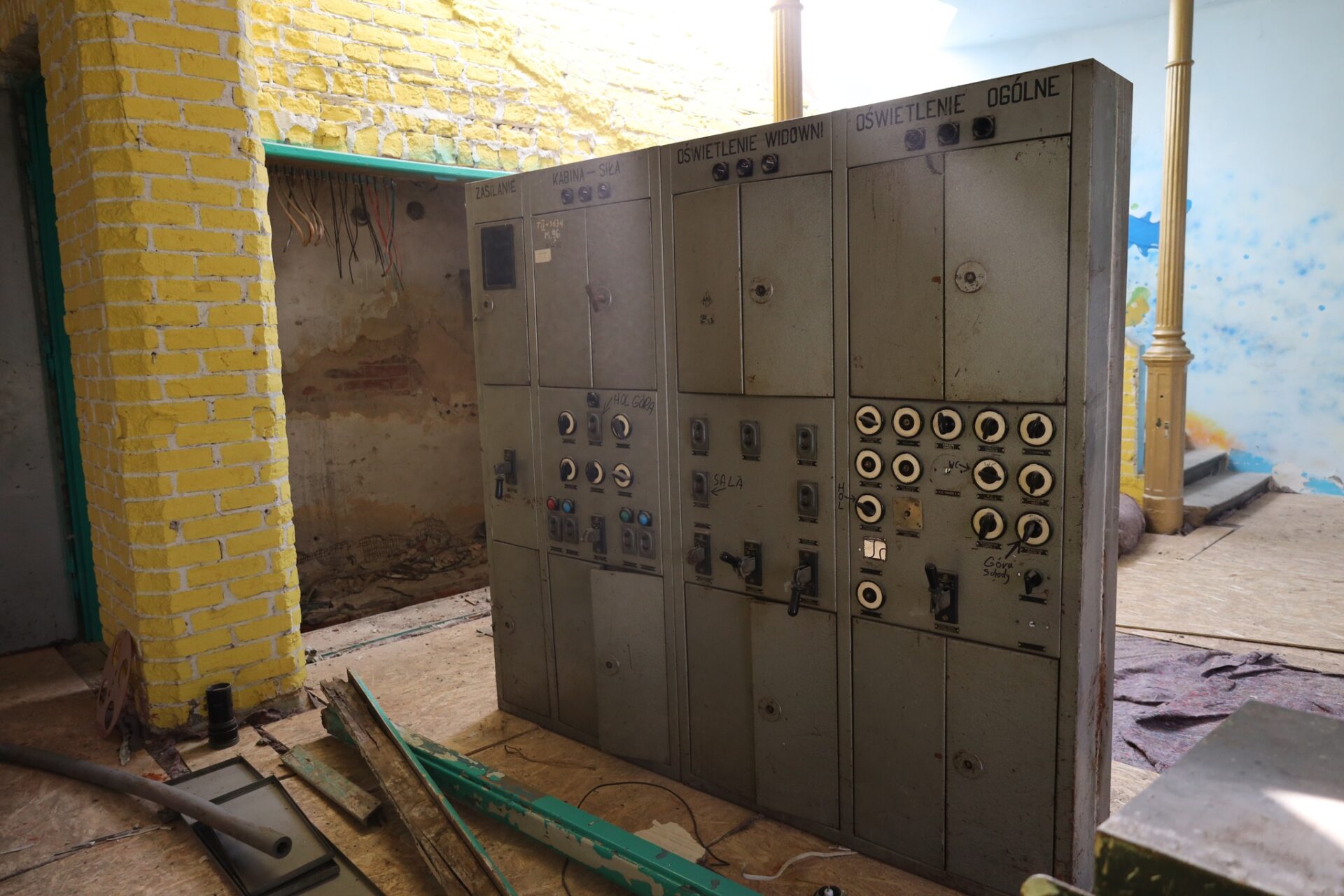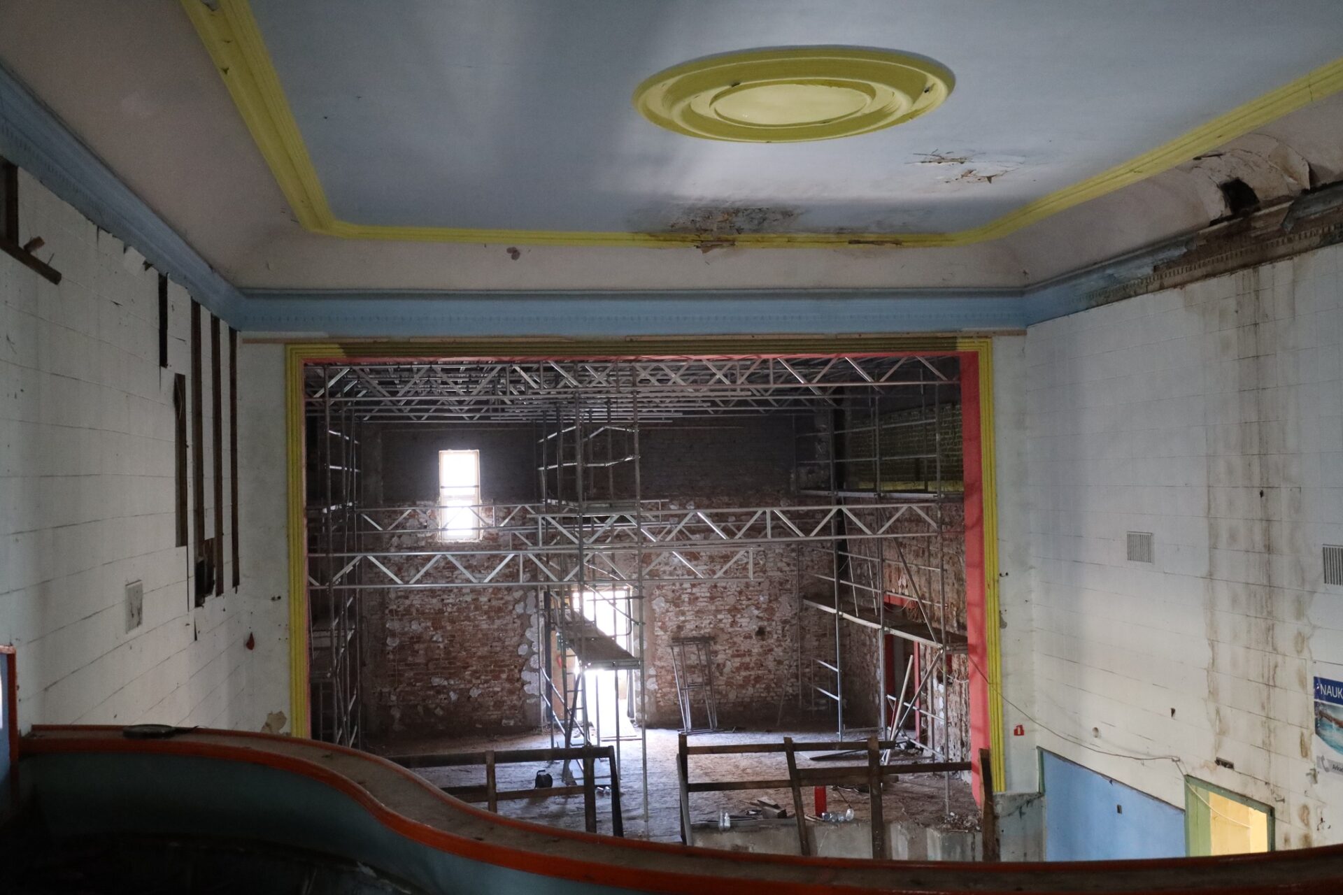 W zabytkowym budynku Kinemy w Radomsku trwają intensywne prace przygotowawcze do kompleksowej rewitalizacji. Robotnicy odsłaniają historyczne elementy konstrukcji, aby dokładnie ocenić stan techniczny ścian i stropów przed rozpoczęciem kolejnych etapów remontu.