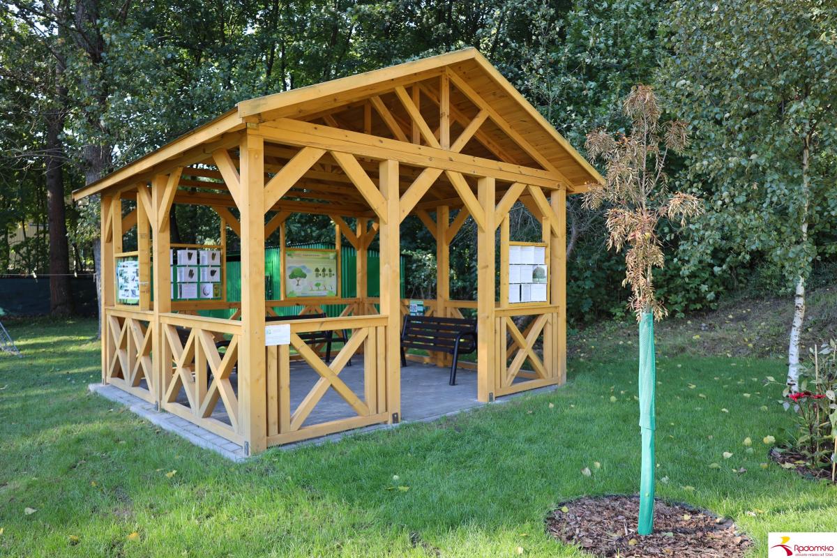 wiata edukacyjna – z tablicami tematycznymi o ptakach i drzewach.