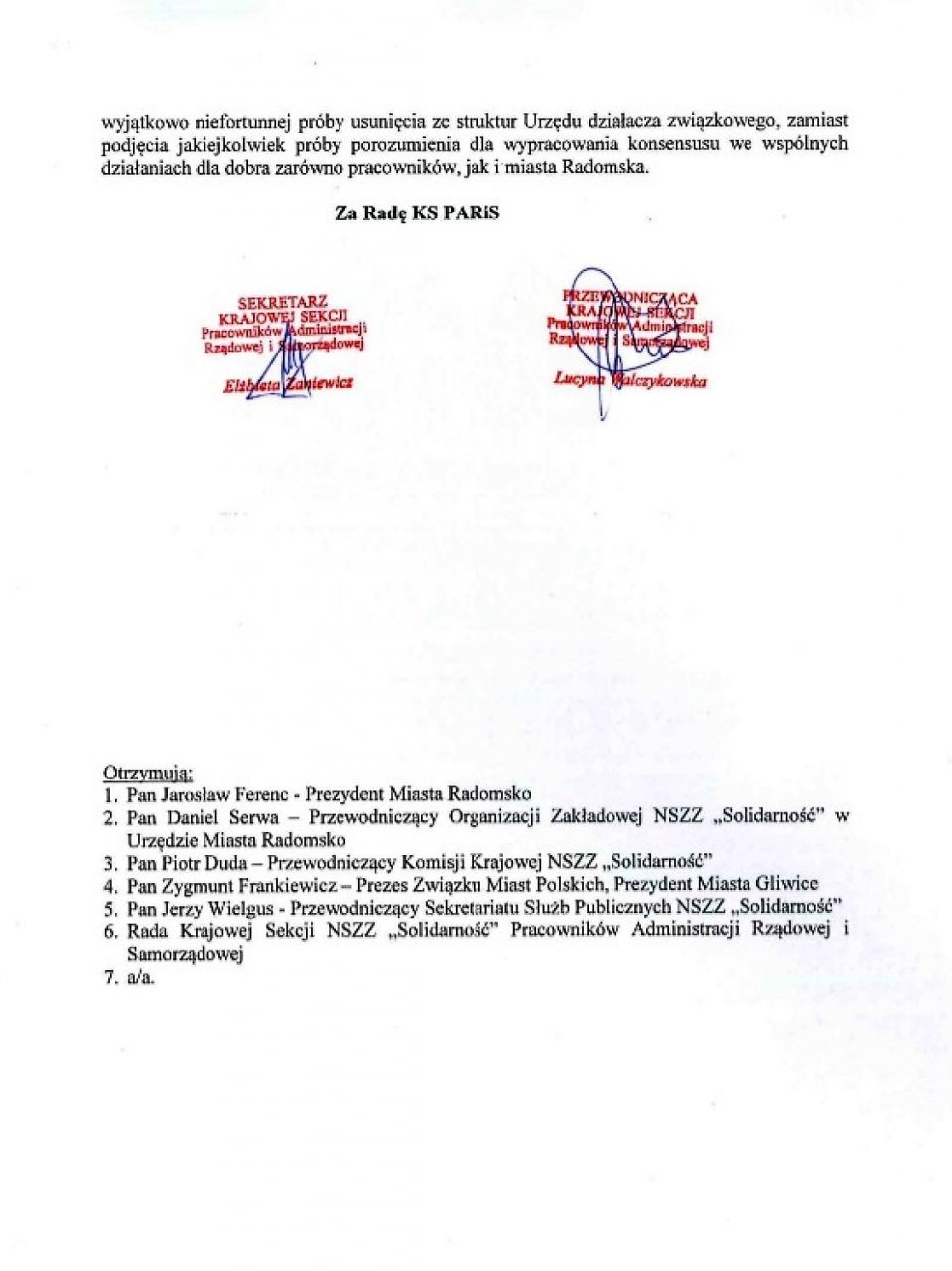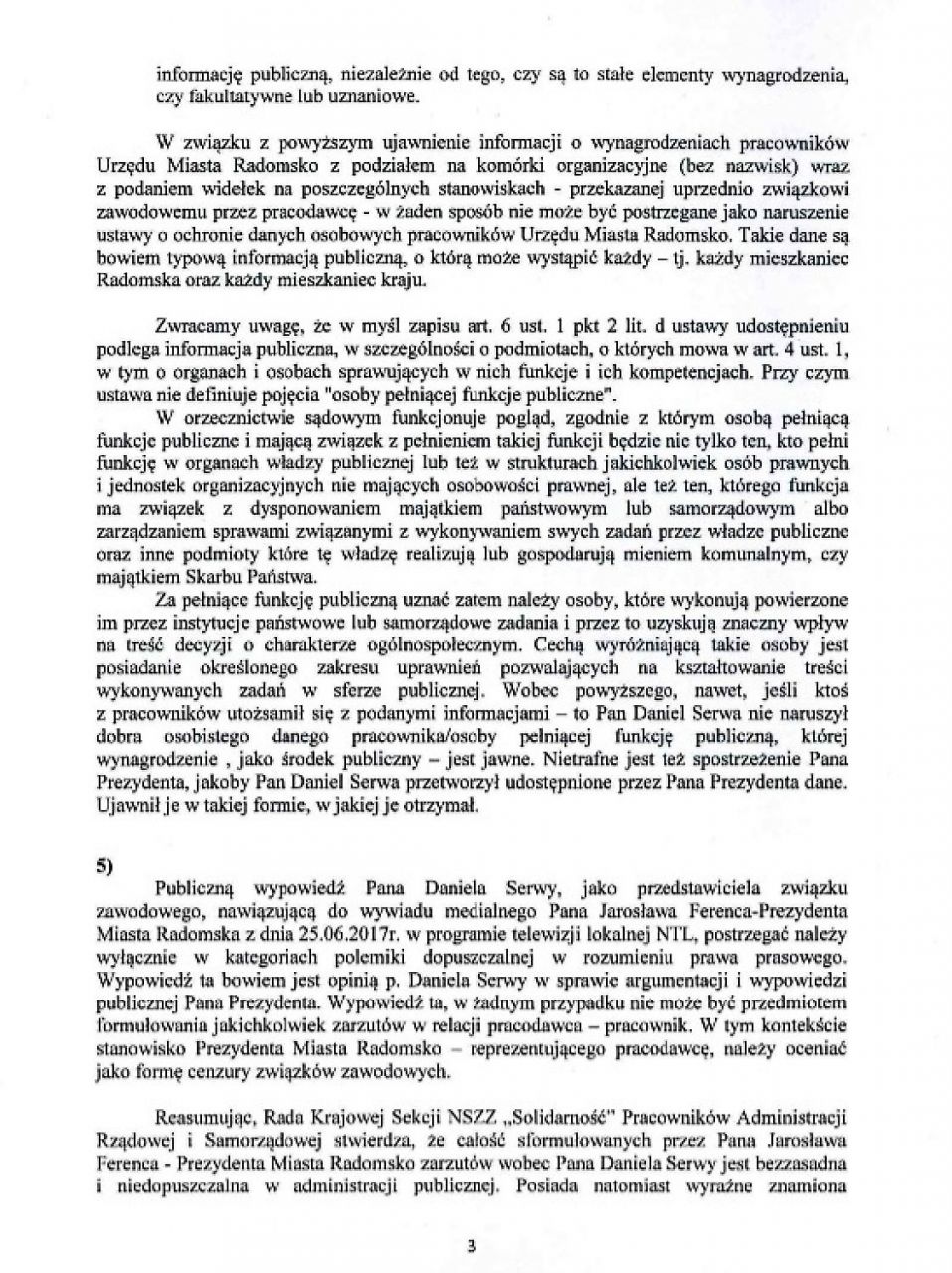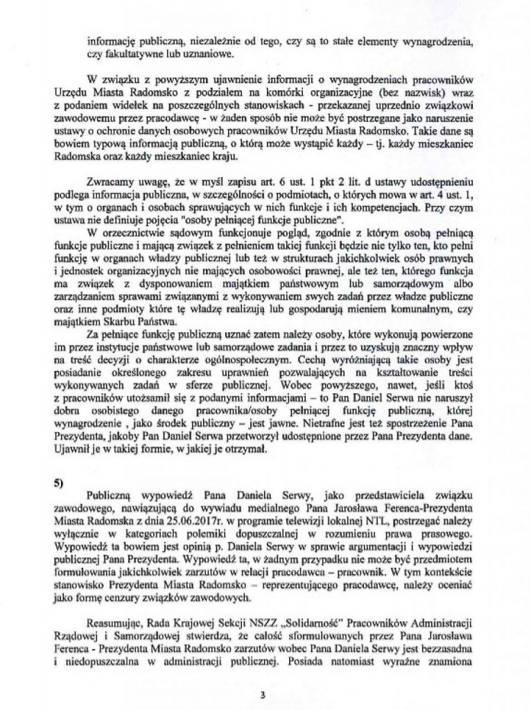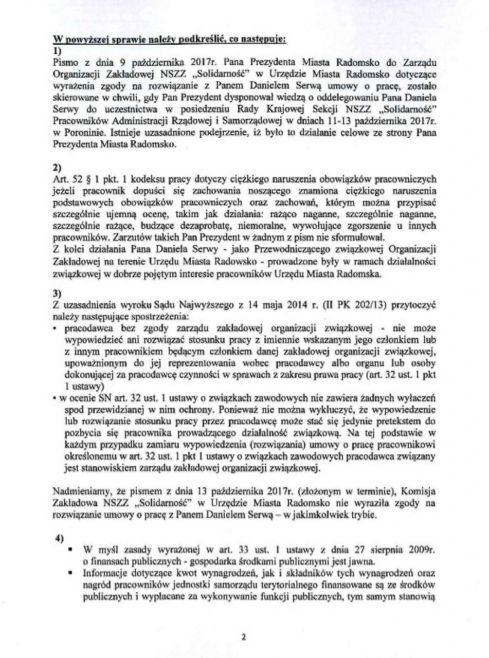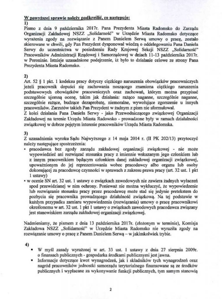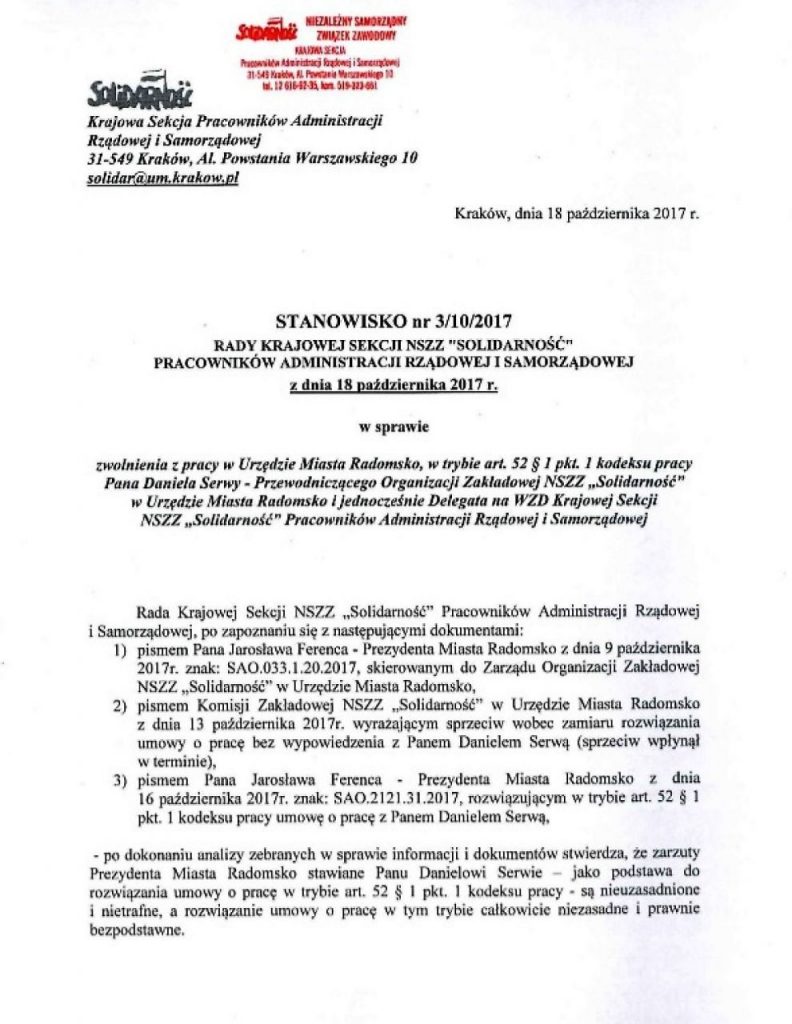 „Brak natychmiastowego przywrócenia do pracy kolegi Daniela Serwy skutkować będzie podjęciem przez Zarząd Regionu Ziemi Łódzkiej NSZZ „Solidarność” akcji protestacyjnych w celu obrony słusznego interesu członka Zarządu” – czytamy w piśmie podpisanym przez Waldemara Krenca, przewodniczącego Zarządu Regionu Ziemi Łódzkiej NSZZ „Solidarność”.