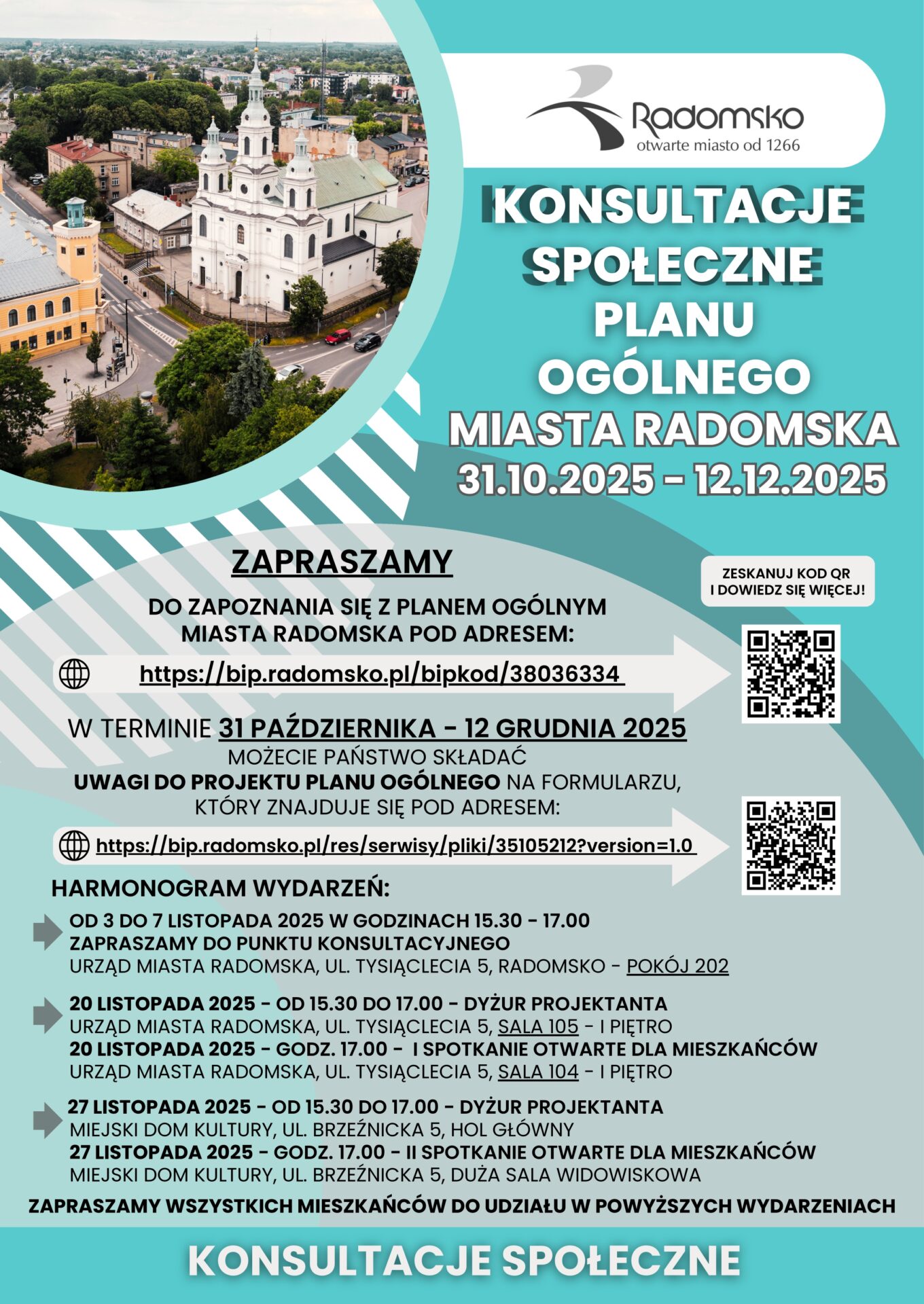 Miasto Radomsko zaprasza wszystkich mieszkańców do udziału w konsultacjach społecznych projektu Planu Ogólnego Miasta Radomska, które potrwają od 31 października do 12 grudnia 2025 roku. To ważny etap w procesie planowania przestrzennego miasta, w którym każdy radomszczanin może wyrazić swoje opinie i zgłosić uwagi do przygotowywanego dokumentu.